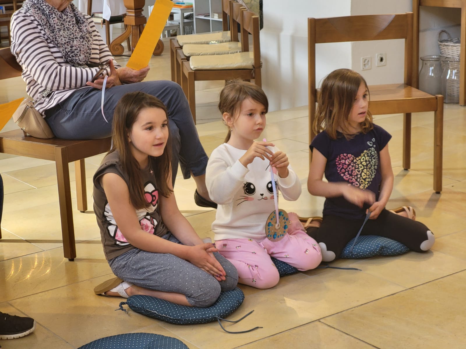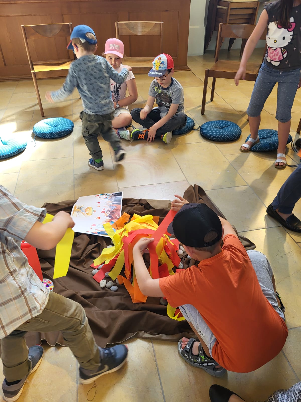 In der Kir­che hör­ten die Teil­neh­mer die Geschich­te vom Hei­li­gen Geist — jenem Moment an Pfing­sten, als der Geist Got­tes wie ein Wind und in Feu­er­zun­gen über die Jün­ger kam. Sie san­gen, bete­ten und durf­ten anschlies­send far­ben­fro­he Son­nen­fän­ger basteln, wel­che die Son­nen­strah­len ein­fan­gen und in bezau­bern­de Licht­spie­le ver­wan­deln. Ein schö­nes Andenken an die Fei­er und zugleich ein Sym­bol für den leuch­ten­den Fun­ken des Hei­li­gen Geistes.