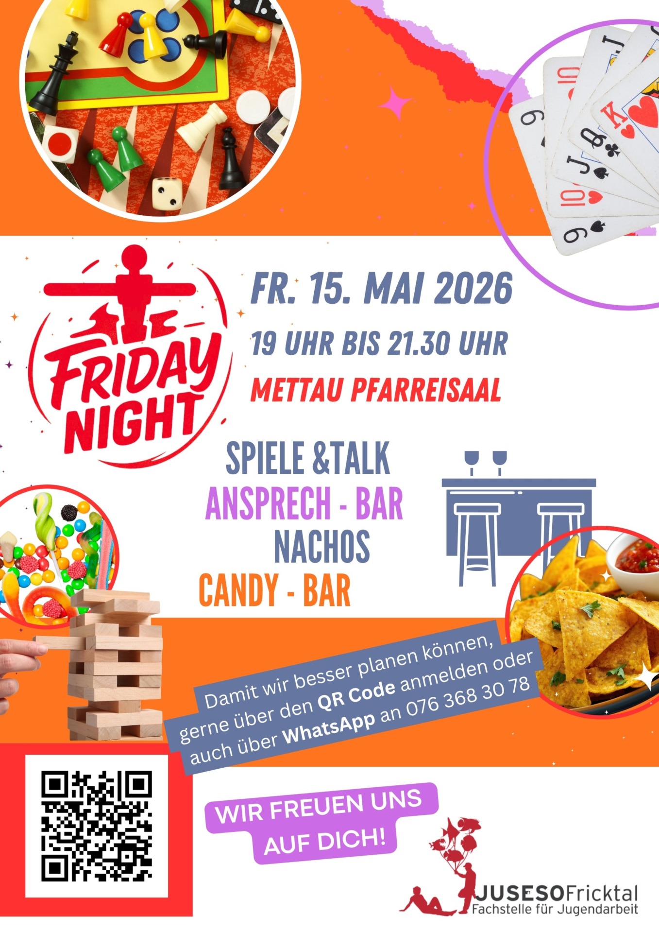 Die Juse­so Frick­tal führt alle 2 Mona­te einen offe­nen Jugend­treff an unter­schied­li­chen Orten durch. Am 15. Mai 2026 fin­det in Met­tau im Pfar­rei­saal eine #Fri­day Night statt.