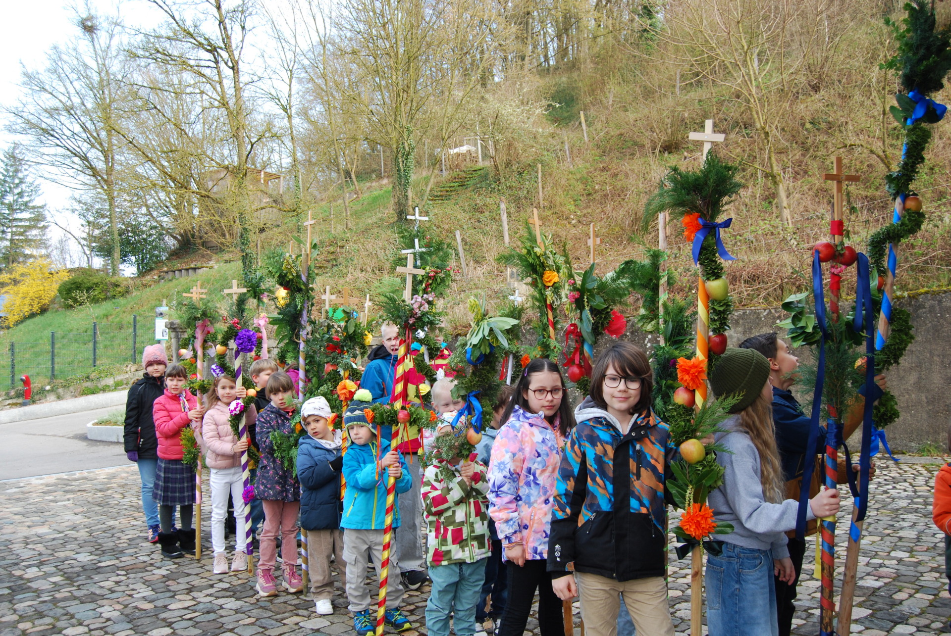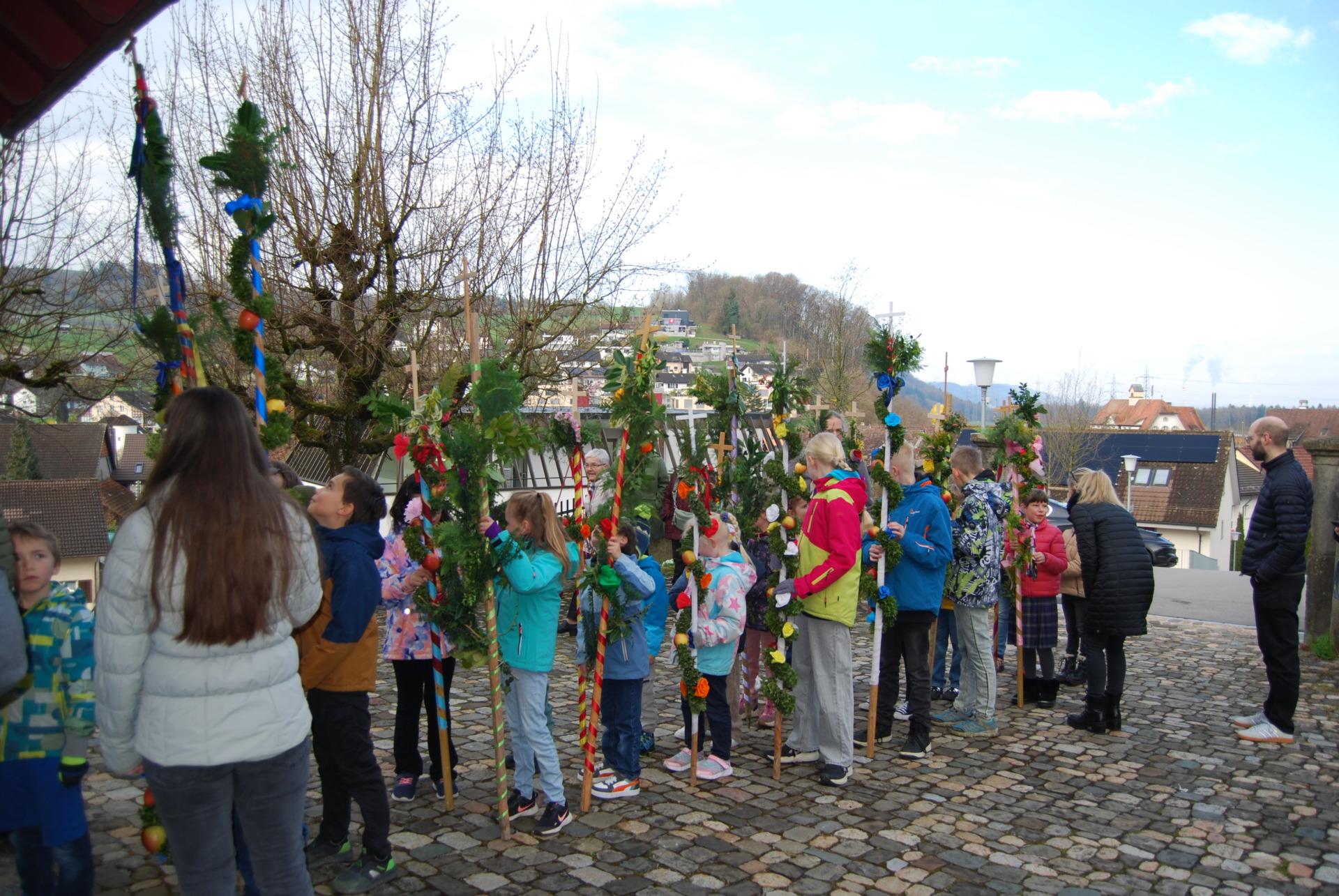 Viele Kinder und auch Erwachsene standen am Sonntagmorgen trotz Zeitverschiebung und Kälte freudig mit ihren schön geschmückten Palmen zur Segnung vor der Kirche bereit.